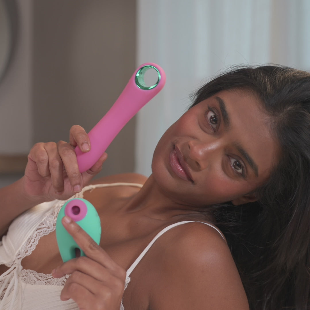 Pyaari has 5 suction modes and 10 vibration modes for external use. The pink side provides suction for c!*toral stimulation, while the blue ends deliver vibrations. Start on a low setting, add lube if needed, and adjust the modes to find what feels best.